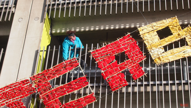 Groepsproject Salix in het kader van Culturele hoofdstad 2018 te Leeuwarden. Bij parkeergarage de Klanderij. Het werk: "Bjusterbaarlik"".